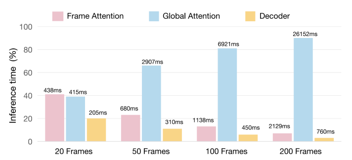 - Frame Attention(帧内交互) 与 Global Attention(跨帧交互)在短序列时,两者开销相当;但随着帧数增加,Global Attention 的计算量占据主要时间消耗。