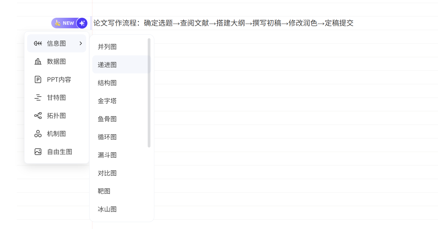 选择后,AI会自动识别步骤逻辑,几秒内生成单线流程图,信息简洁清晰,样式明快多样,轻松易懂又好看。