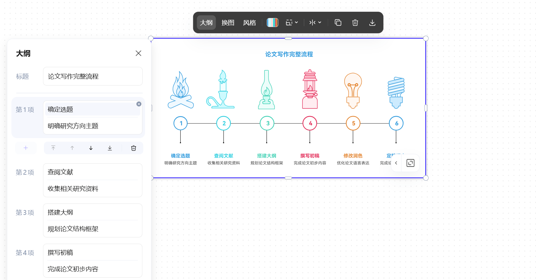 单线程流程图:可直接在编辑界面拖动节点位置、修改步骤文字,或更换流程图模板、样式(比如把横向布局模板改为纵向布局模板)。通过“大纲”功能,也可以增减流程步骤。