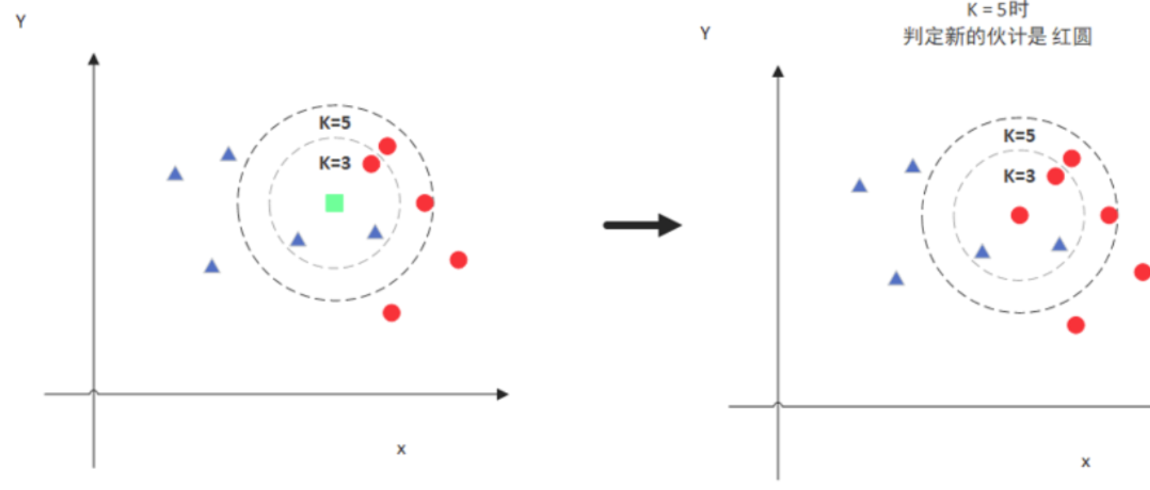 算法中的K在KNN中,称为超参数(Hyper parameter)(超参数就是需要你手动设定的参数),需要人为选择不同的K值