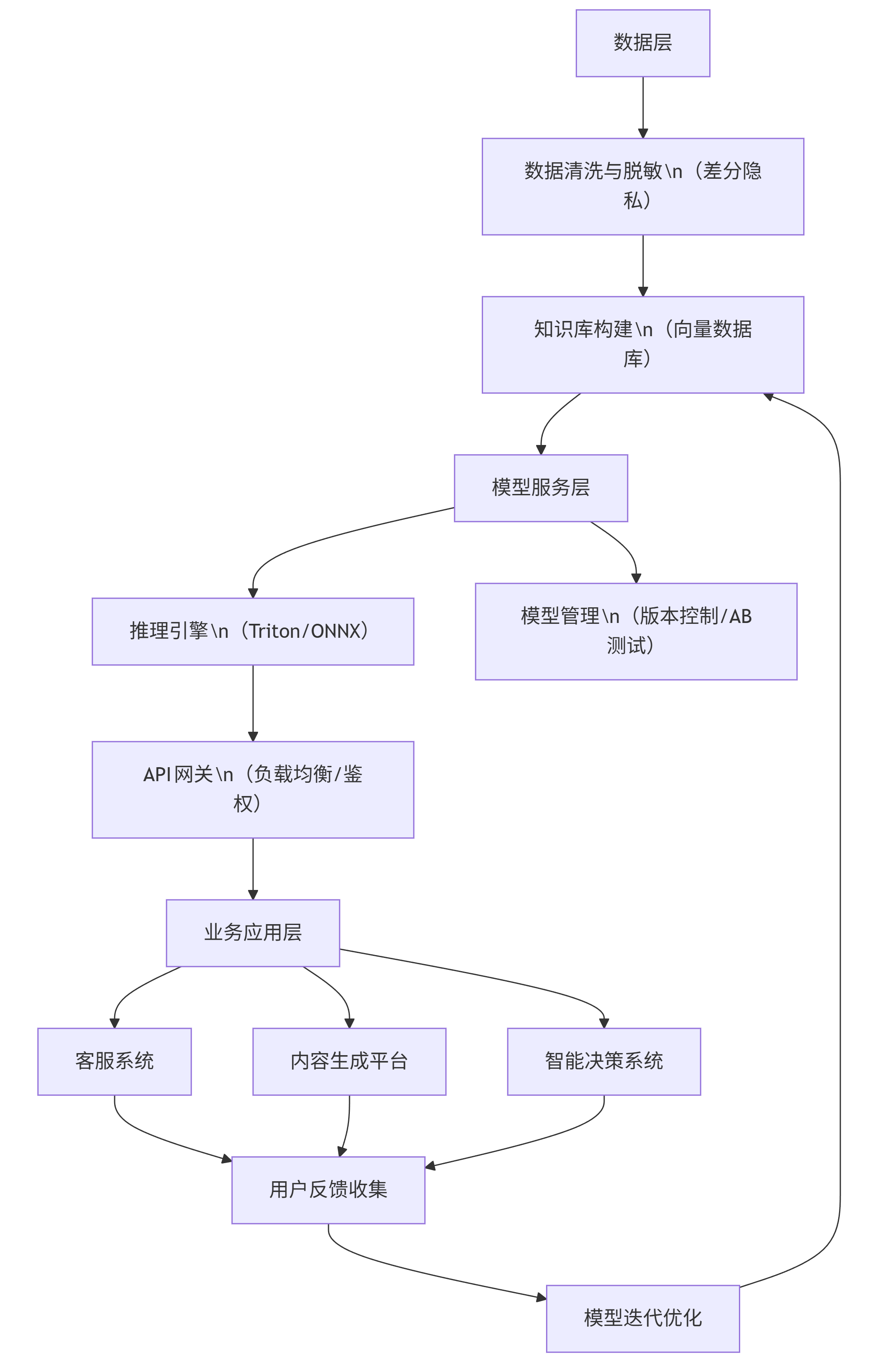 graph TD A[数据层] --> B[数据清洗与脱敏\n(差分隐私)] B --> C[知识库构建\n(向量数据库)] C --> D[模型服务层] D --> E[推理引擎\n(Triton/ONNX)] D --> F[模型管理\n(版本控制/AB测试)] E --> G[API网关\n(负载均衡/鉴权)] G --> H[业务应用层] H --> I[客服系统] H --> J[内容生成平台] H --> K[智能决策系统] I --> L[用户反馈收集] J --> L K --> L L --> M[模型迭代优化] M --> C