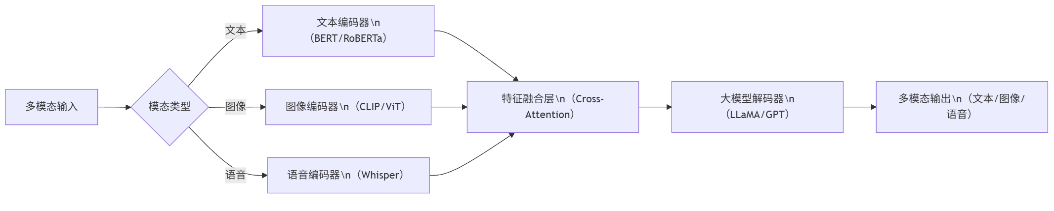 graph LR A[多模态输入] --> B{模态类型} B -->|文本| C[文本编码器\n(BERT/RoBERTa)] B -->|图像| D[图像编码器\n(CLIP/ViT)] B -->|语音| E[语音编码器\n(Whisper)] C --> F[特征融合层\n(Cross-Attention)] D --> F E --> F F --> G[大模型解码器\n(LLaMA/GPT)] G --> H[多模态输出\n(文本/图像/语音)]
