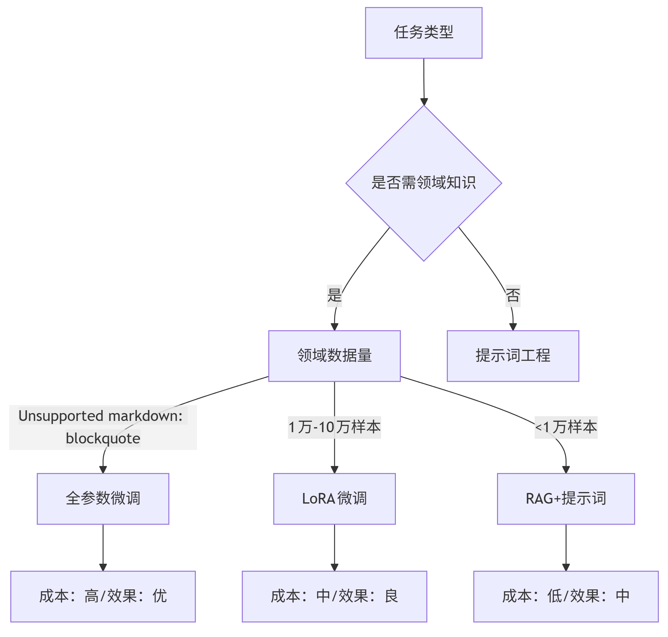 graph TD A[任务类型] --> B{是否需领域知识} B -->|是| C[领域数据量] B -->|否| D[提示词工程] C -->|>10万样本| E[全参数微调] C -->|1万-10万样本| F[LoRA微调] C -->|<1万样本| G[RAG+提示词] E --> H[成本:高/效果:优] F --> I[成本:中/效果:良] G --> J[成本:低/效果:中]