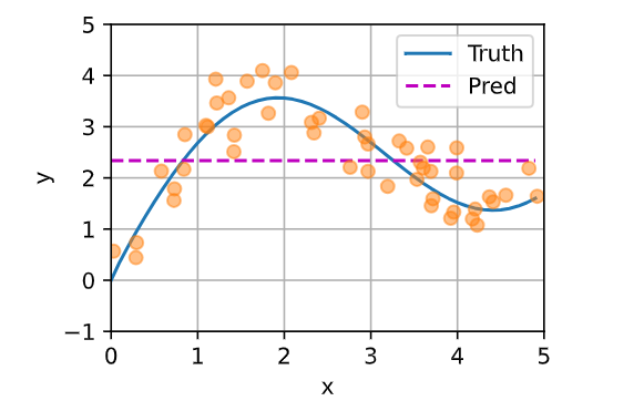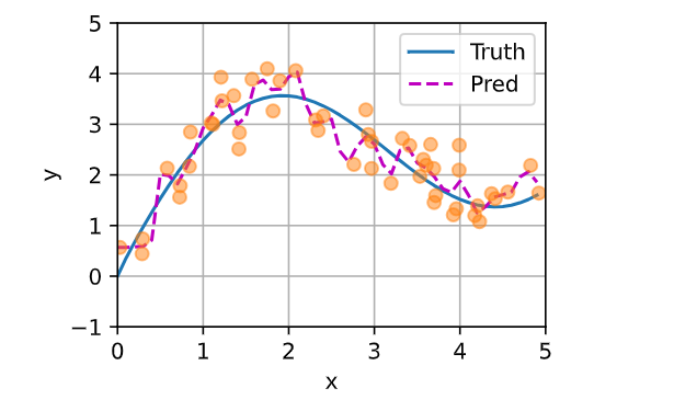 样本由圆圈表示,Truth表示不带噪声项的真实数据生成函数;Pred表示学习得到的预测函数。