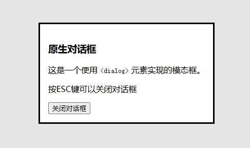 <button onclick="document.getElementById('modal').showModal()">打开弹窗</button>