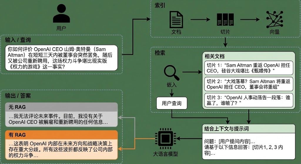 Answer: 模型输出准确答案(如图中“With RAG”部分,能够详细解释 Sam Altman 事件)。