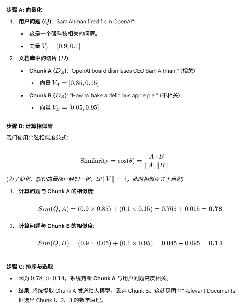 系统在向量数据库中计算“Query 向量”与“文档 Chunk 向量”的相似度。