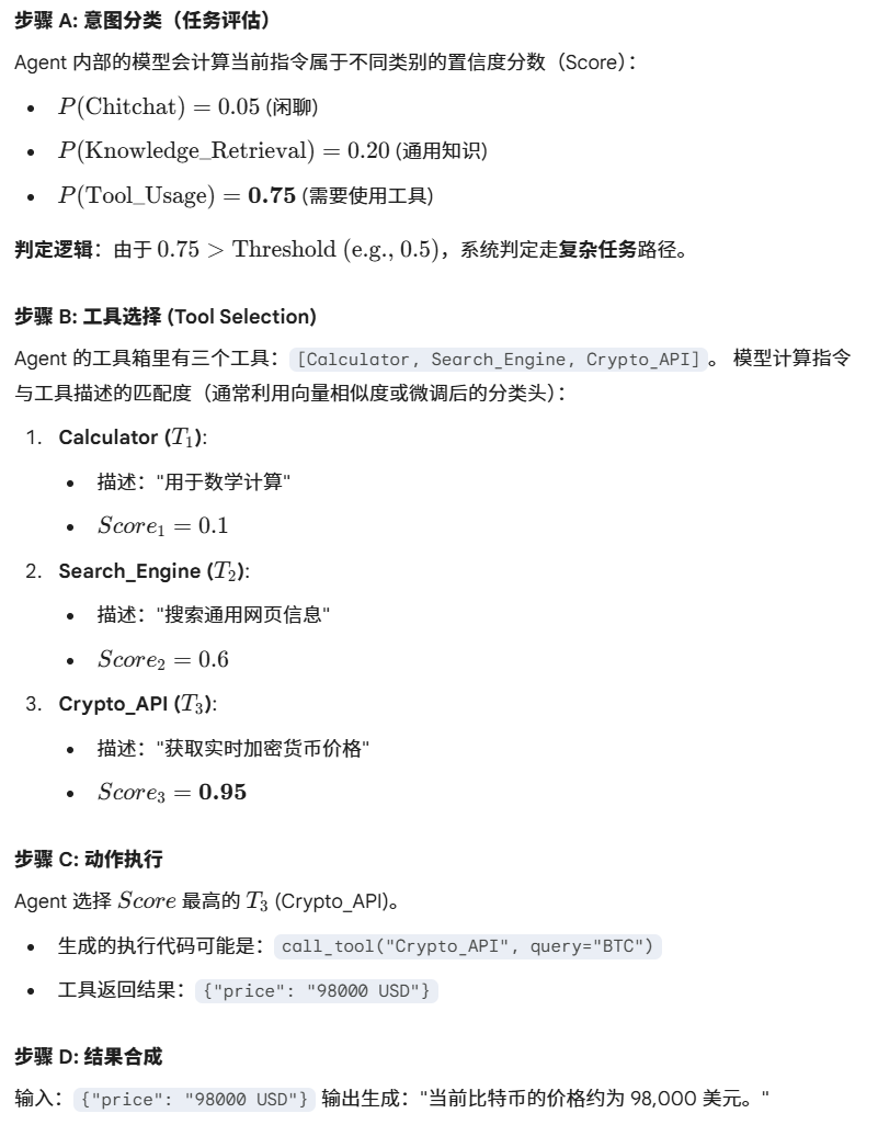 假设 Agent 此时面临用户指令:“查询一下现在的比特币价格。”