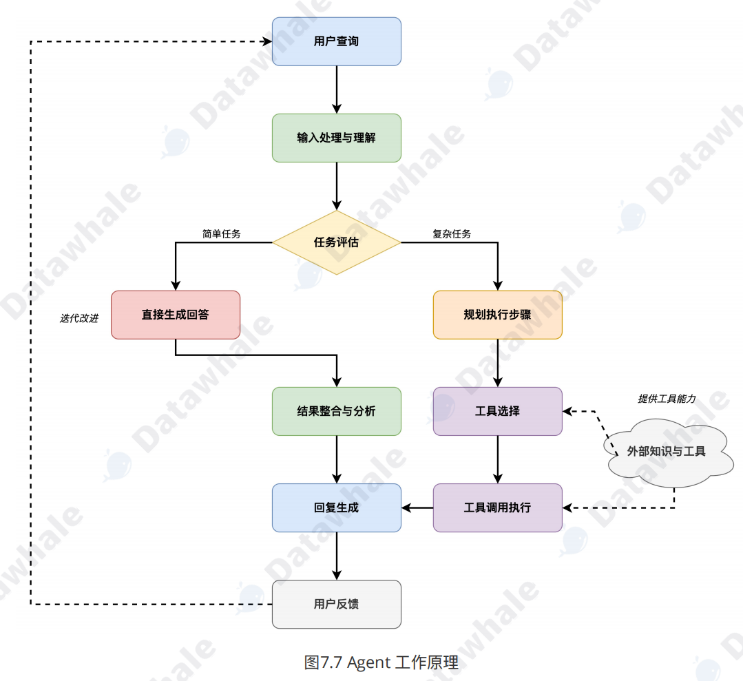 总结: 如果说 RAG 是给模型外挂了一个图书馆,那 Agent 就是给模型外挂了一个身体和工具箱。引言部分的图片,完美展示了从用户指令出发,经过大脑判断(中间菱形),最终通过手脚(右侧工具链)解决问题的完整闭环。