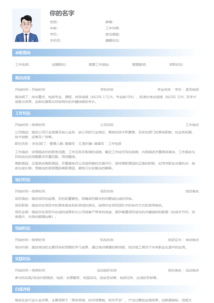 格式建议:标准化简历模板是最佳选择,能有效将HR注意力从“你做过什么职位”转移到“你具备什么能力”。