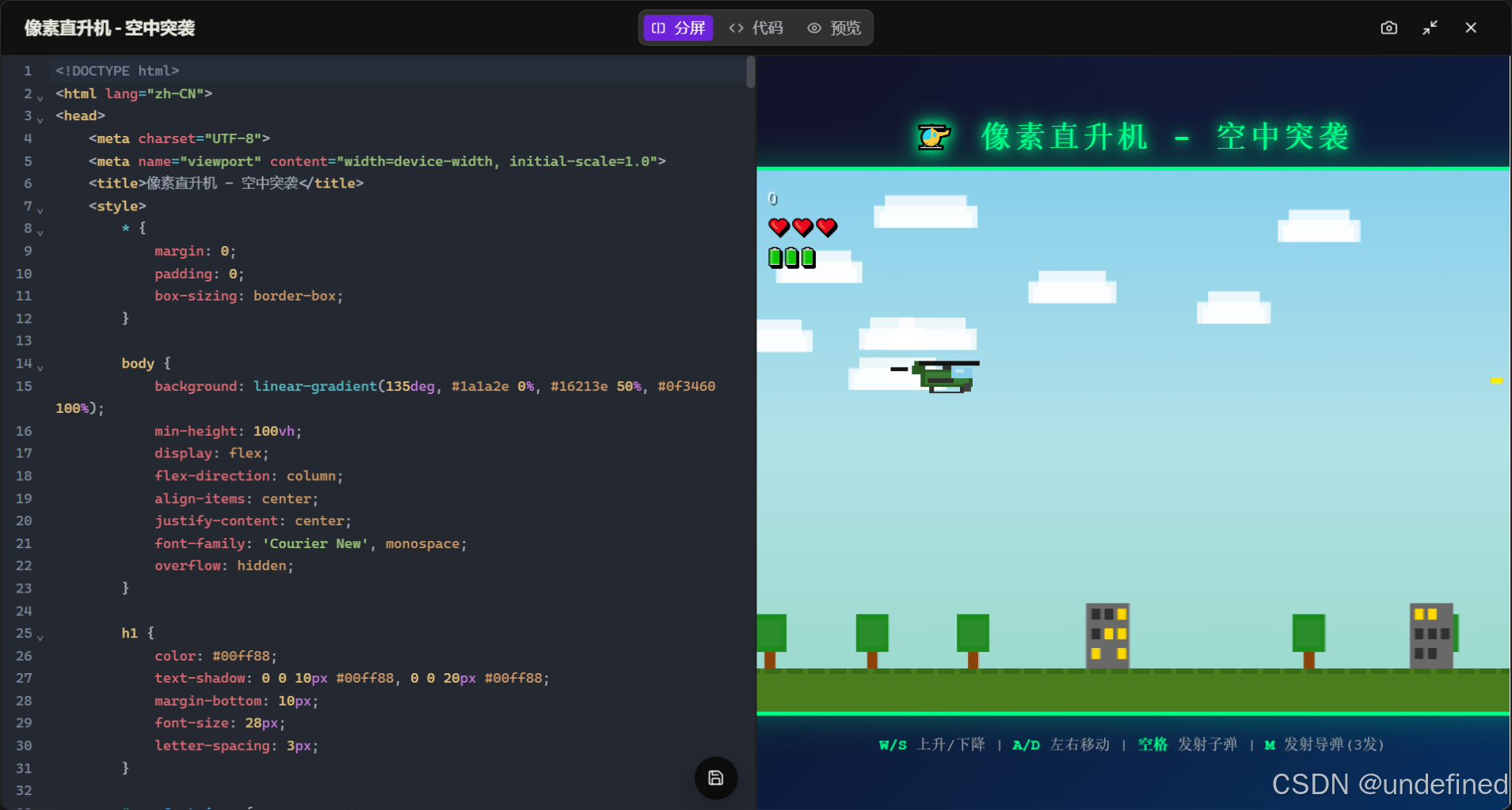 我直接给 MiniMax 下了个复杂的指令: > “写一个 HTML5 的直升机空中射击游戏,要像素风,能发射导弹,有爆炸特效,支持键盘控制。”