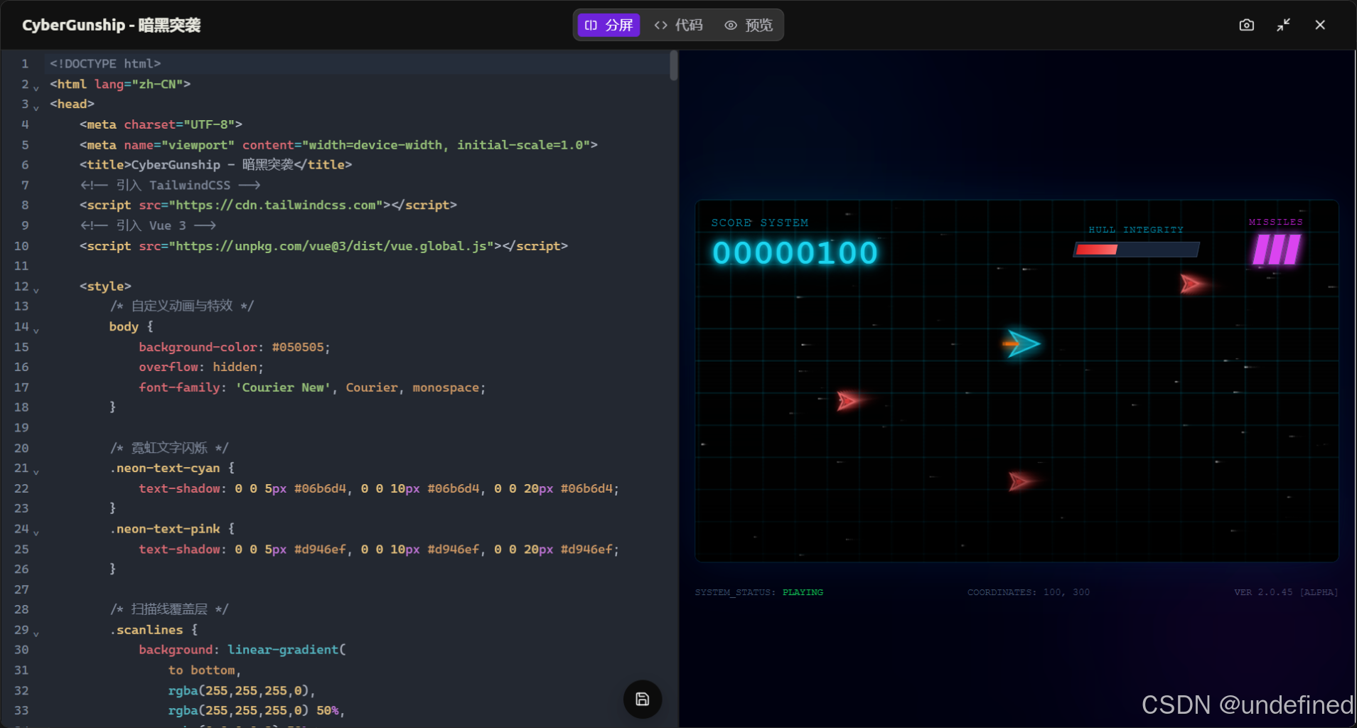 这次我故意在审美上刁难它: > “界面要酷一点,暗黑科技风,用 Vue3 + TailwindCSS。”