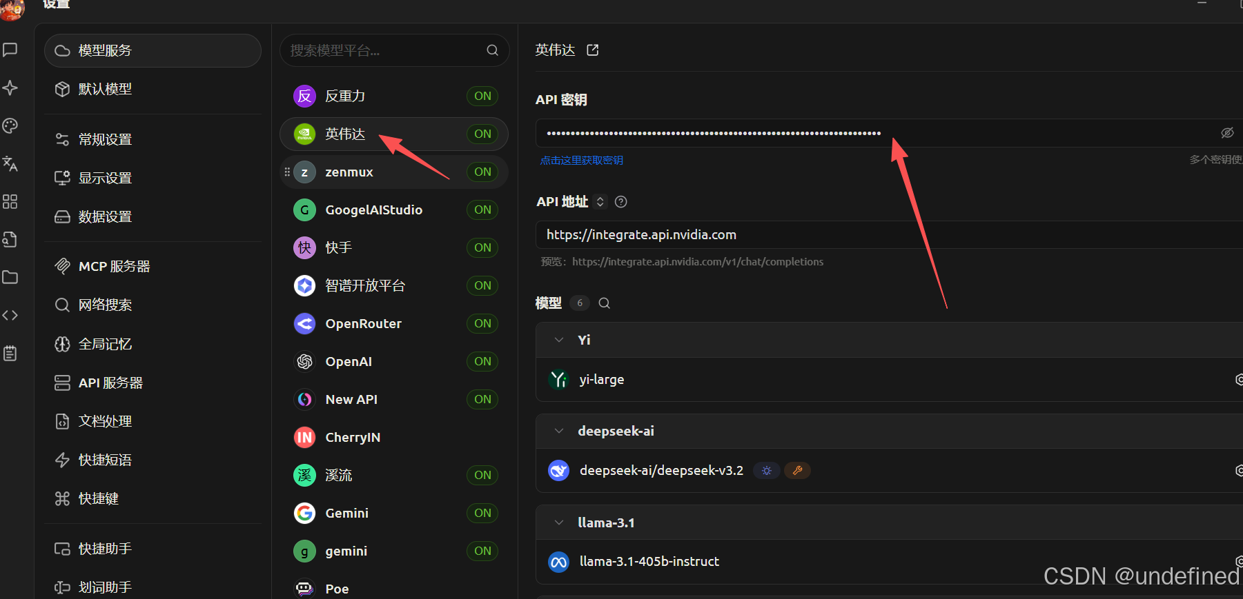 1. 添加服务商 打开 Cherry Studio 设置 -> 模型服务 -> 下拉找到 “英伟达 (NVIDIA)”。 把刚才复制的 nvapi-xxx 粘贴到“API 密钥”栏。
