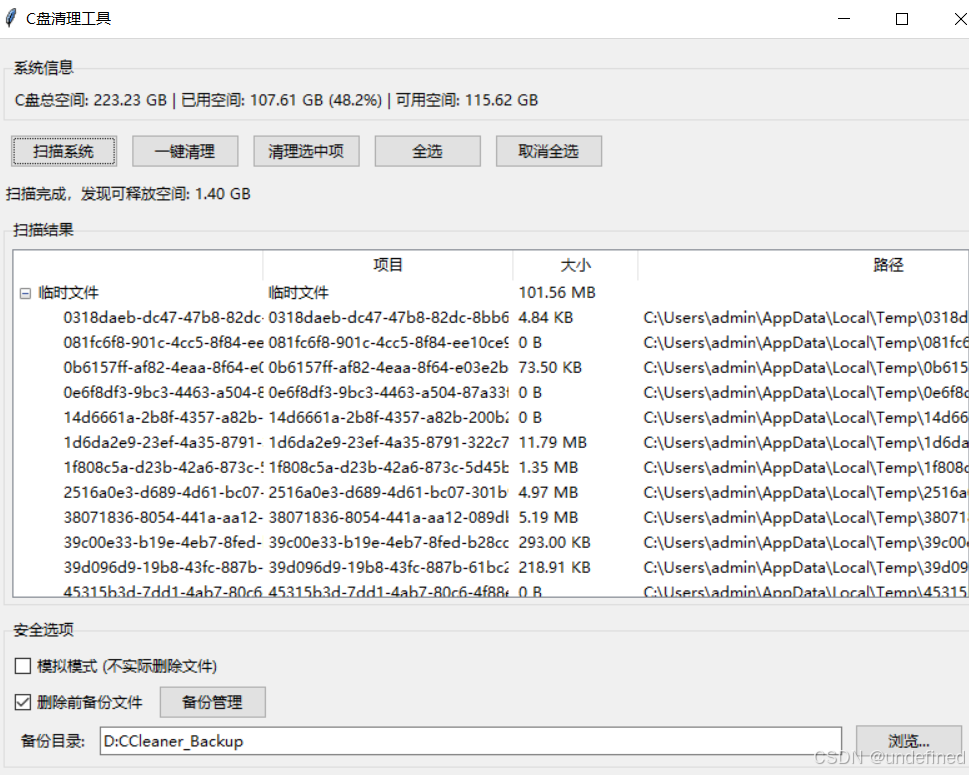 我们点击扫描系统,等待一段时间后可以选择一键清理。这里给大家做了备份,如果删错东西了,我们可以点击备份管理去还原一下。所以大家不用担心。
