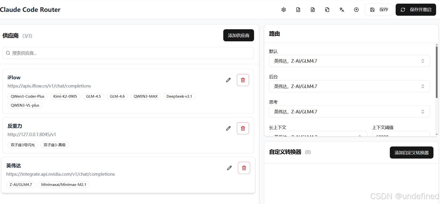 这里我们可以选择添加供应商,然后第一个默认的模板里面没有英伟达,所以我们不用选。然后我们只需要去在Cherry Studio里面呢去复制英伟达的一个API链接和和API密钥去,填到对应的地方就可以了。然后模型的话,我们需要自己手动输入添加。添加好了之后呢,在右边的路由,我们把所有的模型默认配置成英伟达的GLM4.7就可以了,然后点击保存并重启。