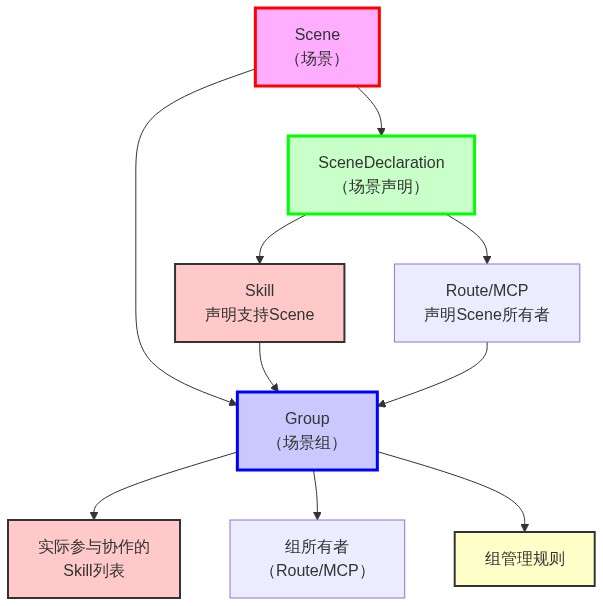 Group(场景组):是基于Scene自动形成的协作组,用于管理同一场景下的Skill协作,包含实际参与协作的Skill列表、组所有者和组管理规则。