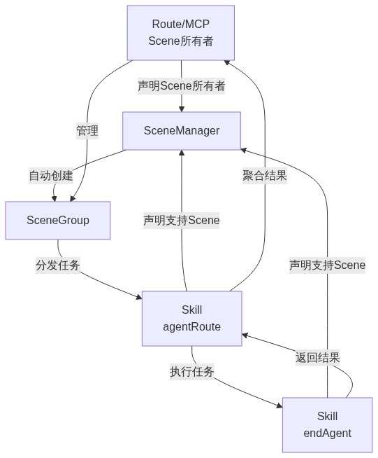 SceneDeclaration是用于Skill声明支持某个Scene,或Route/MCP声明Scene所有者的机制。通过SceneDeclaration,系统可以自动发现和组织多Agent协作资源,实现多Agent协作团队的动态形成。