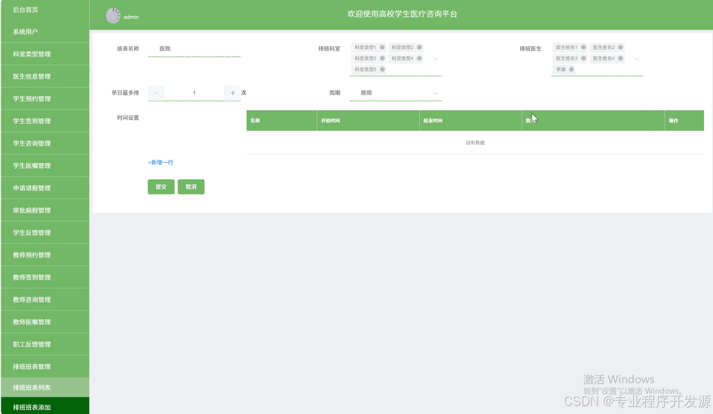排班班表管理:医生可根据自身工作安排及学校医疗需求制定出诊排班计划,确保医疗服务的连续性与稳定性,同时可应对突发情况进行临时调整。