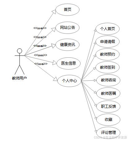 个人中心:教师可以管理个人信息,查看个人首页、申请请假、进行教师预约、教师签到、教师咨询、查看教师医嘱、提交职工反馈、收藏感兴趣的内容以及管理评论。