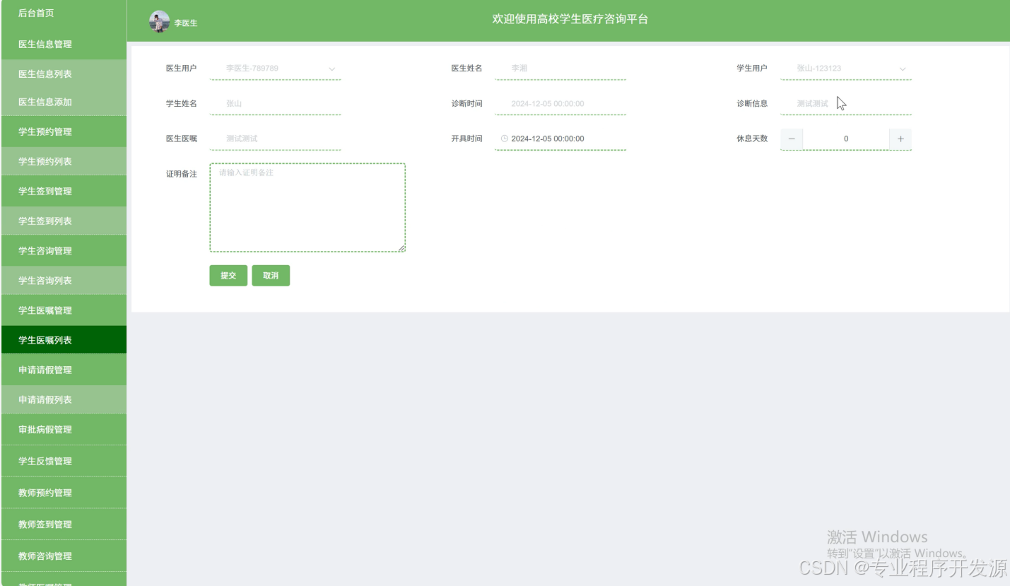 医生记录和管理为学生开具的医嘱,包括用药指导、康复建议等,确保学生能够准确执行医嘱,促进身体健康恢复,提高治疗效果。此外,医生还可以根据学生的反馈和病情变化,及时调整治疗方案和医嘱内容,实现精准医疗。界面如下图所示。