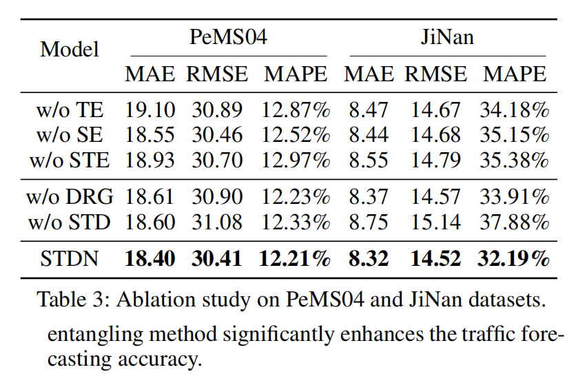 此外,当将时空感知的趋势–季节性分解模块替换为不考虑时空上下文的分解方式时,模型性能同样出现明显退化。这一结果验证了在交通网络场景下,将序列分解过程与时空信息紧密结合,有助于提升模型对复杂交通模式的刻画能力。