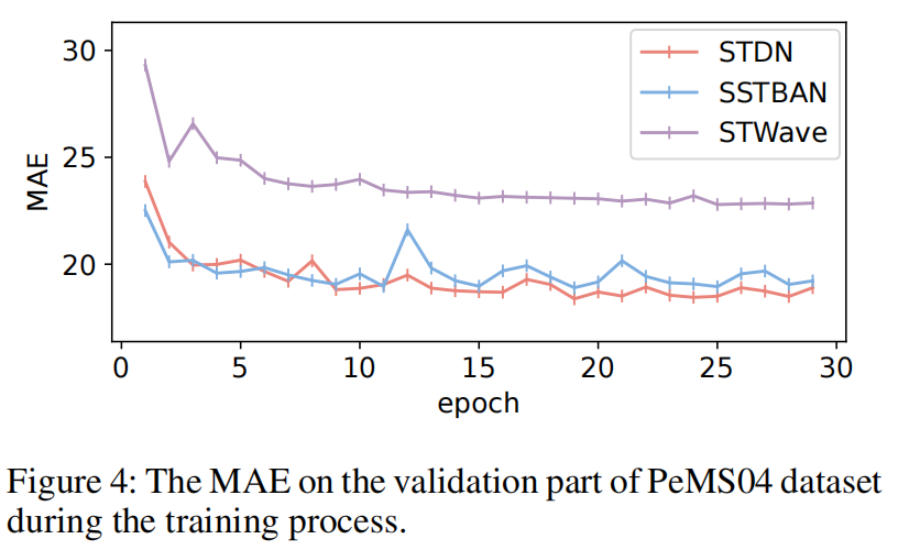 此外,图 4 展示了模型在验证集上的训练过程变化情况。可以观察到,本文模型在较少的训练轮数内即可达到稳定性能,相较于对比方法具有更快的收敛速度。这一现象表明,通过引入结构化的时空建模与趋势–季节性分解机制,模型在训练过程中能够更高效地学习交通流的关键模式。