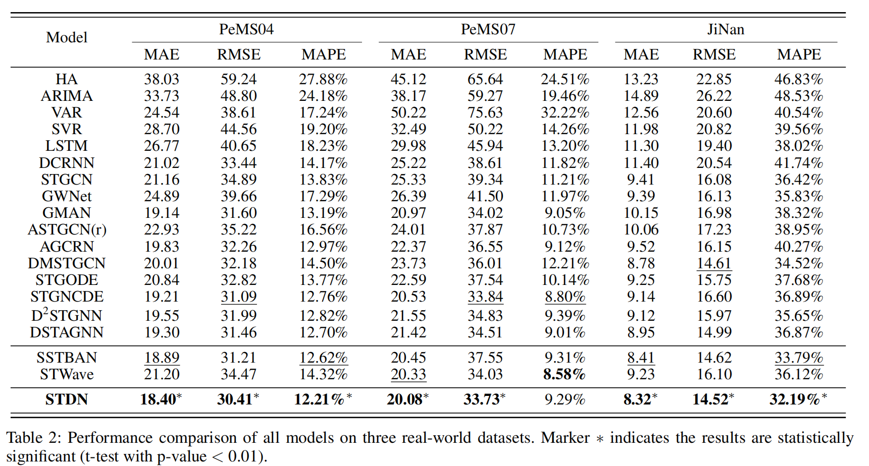 论文简介:这篇论文提出了一种 时空感知的趋势–季节性分解网络(STDN) 用于交通流预测,针对现有方法在时空建模和序列分解方面存在的不足,联合建模交通数据中的空间依赖、时间周期性以及趋势与季节性结构。该方法通过引入时空嵌入来刻画时间周期特征与路网空间结构,并在此基础上学习动态关系图以捕捉节点间的高阶时空交互;随后,模型利用时空感知的分解机制将交通序列显式拆分为趋势项和季节项,并通过编码器–解码器架构进行预测。实验结果表明,STDN 在多个真实交通数据集上均优于现有主流方法,在保证较低计算开销的同时显著提升了预测精度,验证了时空嵌入驱动的分解建模在交通预测任务中的有效性。
