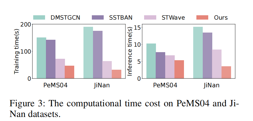 在保证预测精度的同时,模型的计算效率也是实际应用中需要考虑的重要因素。如图 3 所示,本文方法在训练时间和推理时间上均优于部分性能相近的基线模型,表明所提出的框架在建模能力与计算开销之间取得了较好的平衡。这一优势主要得益于模型在结构设计上的简化以及对时空特征的高效建模方式。