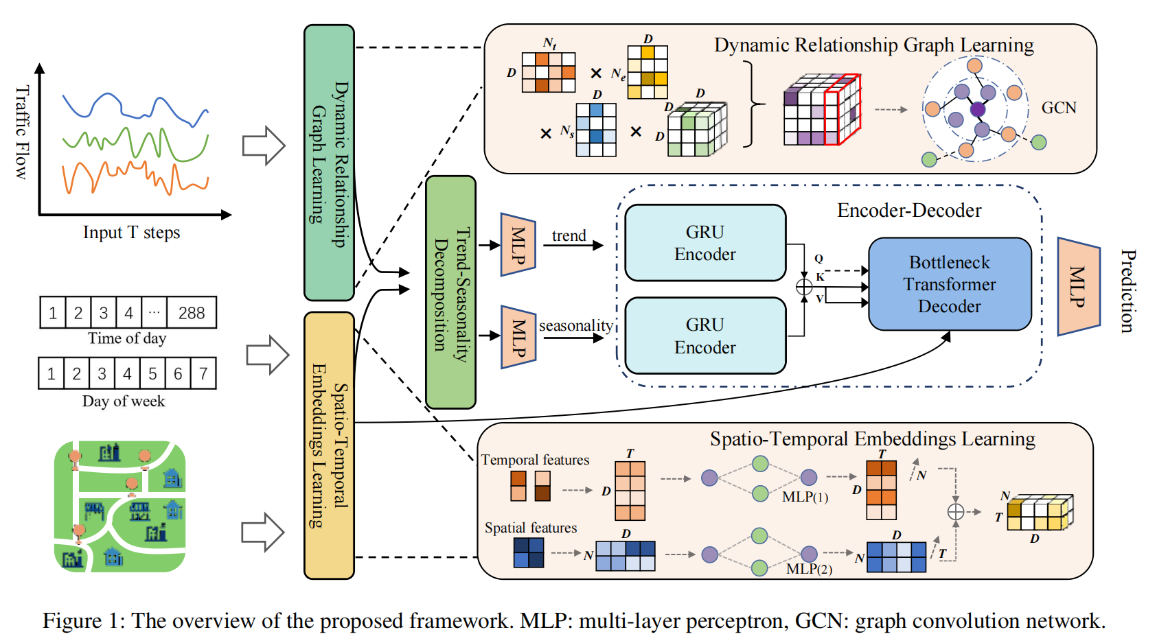 具体而言,模型首先通过时空嵌入学习模块对时间周期信息与道路网络的空间结构进行编码,从而为后续建模提供具有先验意义的时空上下文表示。在此基础上,引入动态关系图学习机制,以刻画交通节点之间随时间变化的高阶交互关系,增强模型对全局空间动态的感知能力。随后,结合所学习到的时空嵌入信息,模型通过趋势–季节性分解模块将交通流表示显式拆分为趋势项与季节项,从而更有针对性地建模不同时间尺度下的变化模式。最后,分解后的表示被送入编码器–解码器结构进行时序建模与预测,生成未来多个时间步的交通流结果。