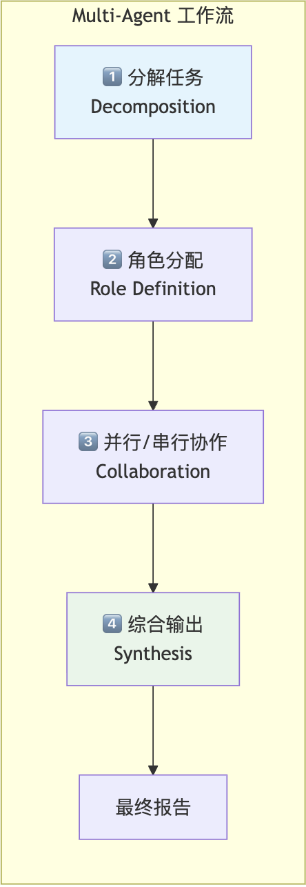 Multi-Agent System 的工作流程遵循 "分解-分配-协作-综合" 的模式: