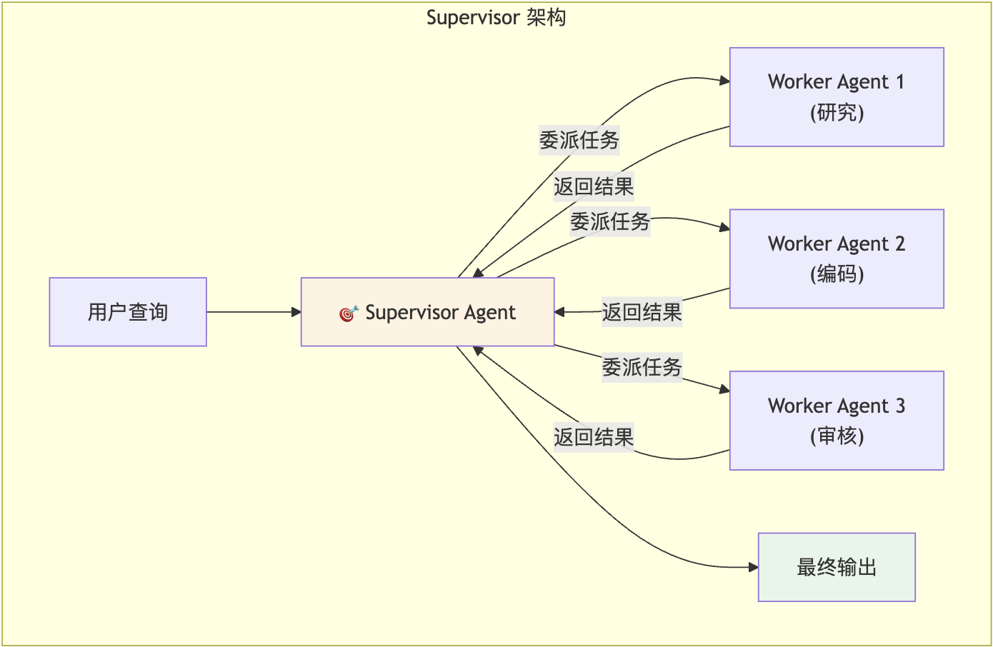 在监督者架构中,一个中央"监督者"Agent 负责编排多个"子 Agent"或"工作者 Agent"。