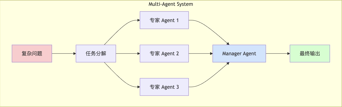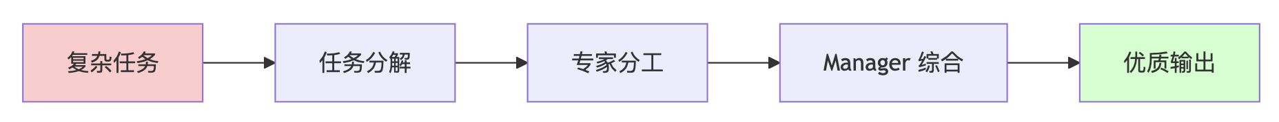 | 4 | 综合输出 | 最终的"Manager"或"Synthesizer" Agent 收集专家 Agent 的输出,组装最终的综合响应 |