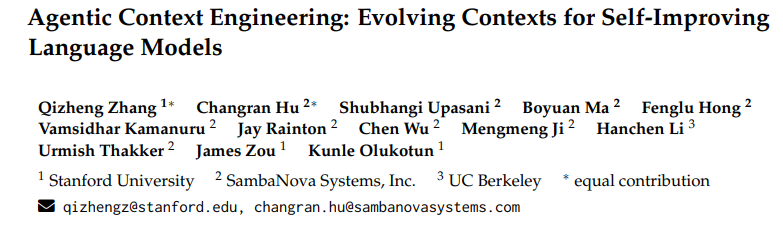 - 论文题目:《Agentic Context Engineering: Evolving Contexts for Self-Improving Language Models》(智能体上下文工程:自我改进语言模型的演化上下文)