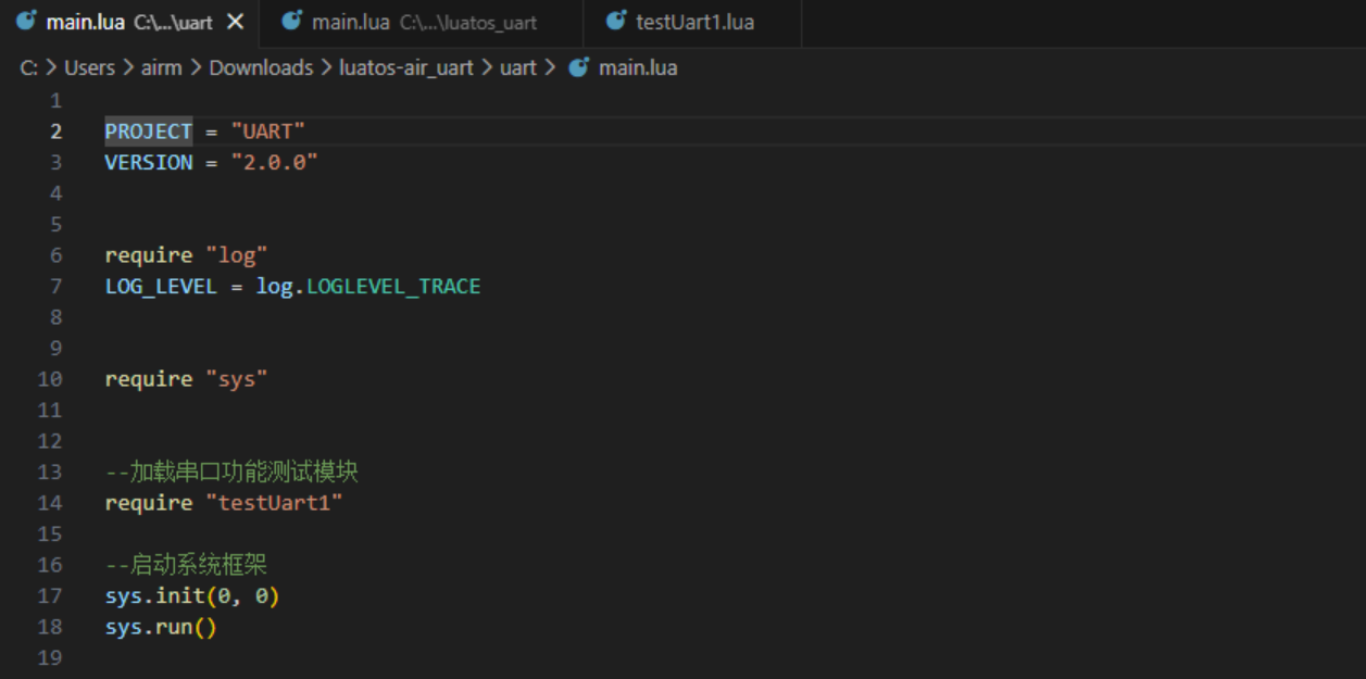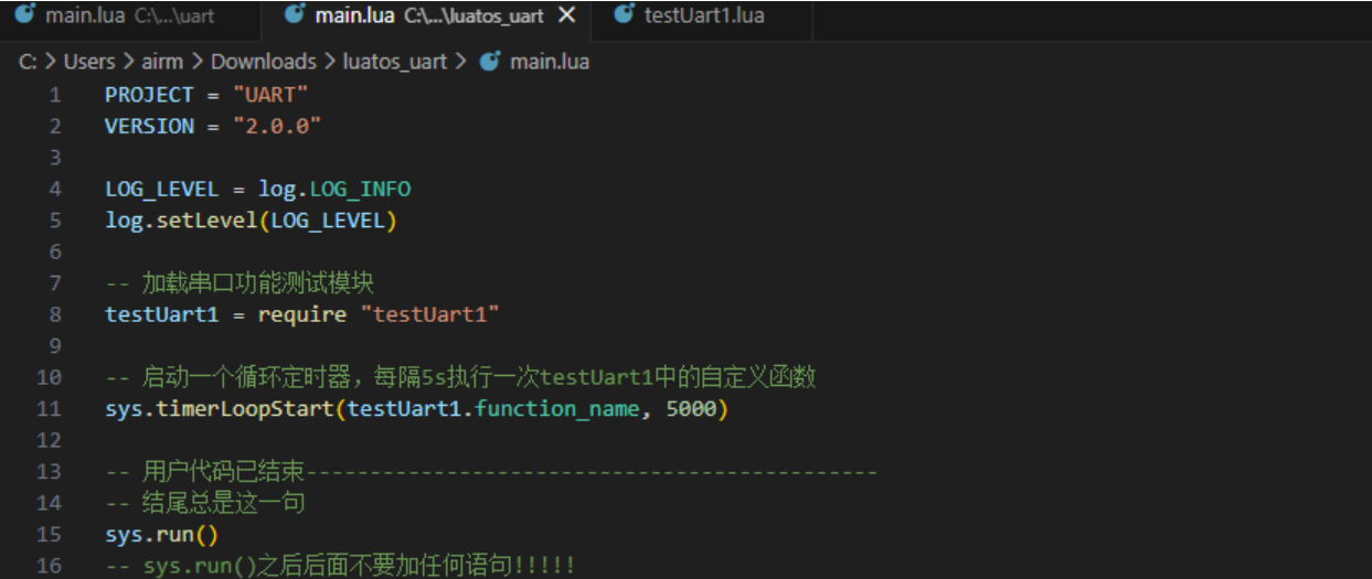 因为主逻辑都在testUart1文件中,不需要在main.lua中调用,所以保持 require "testUart1" 原样即可,为了用户更直观的看出跨文件调用的不同,所以我在testUart1中又写了一个名为function_name的函数,然后在main.lua中进行循环调用。sys.init函数不需要,直接删去即可