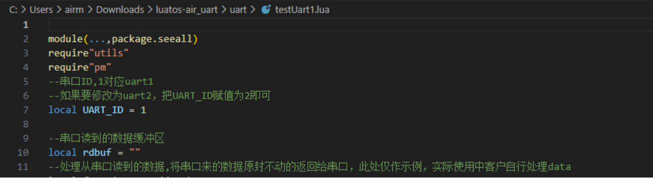 以uart的demo为例,笔者将带着用户,将LuatOS-Air uart的demo,移植到luatos上(仅讲解uart1的移植过程,其他串口通用),除去无关本次移植过程的部分,LuatOS-Air的uart1完整demo如下,是一个自发自收的测试demo,luatos完整的demo也会放在最后,方便用户对比。