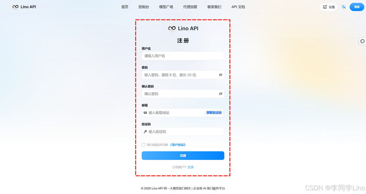在使用 Nano-Banana2 之前,需要先注册 API 平台并获取对应的 API Key。首先进入到API平台:https://linoapi.com.cn/register?aff=sJ68,点击右上角 「登录 / 注册」 完成账号注册。(新注册账号默认赠送 0.4 元 体验额度,不够的话可在【钱包】中按需充值。)
