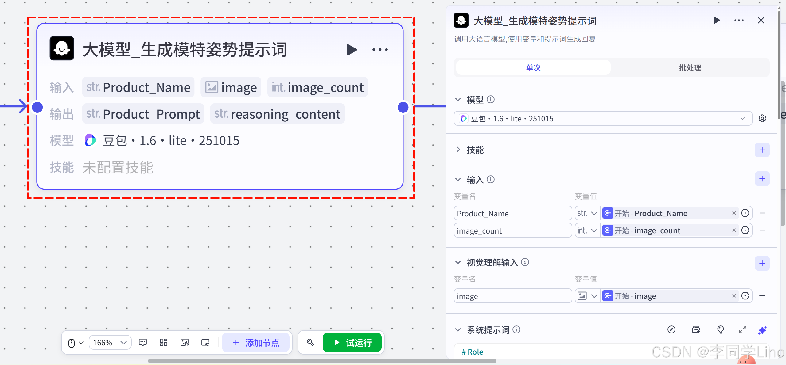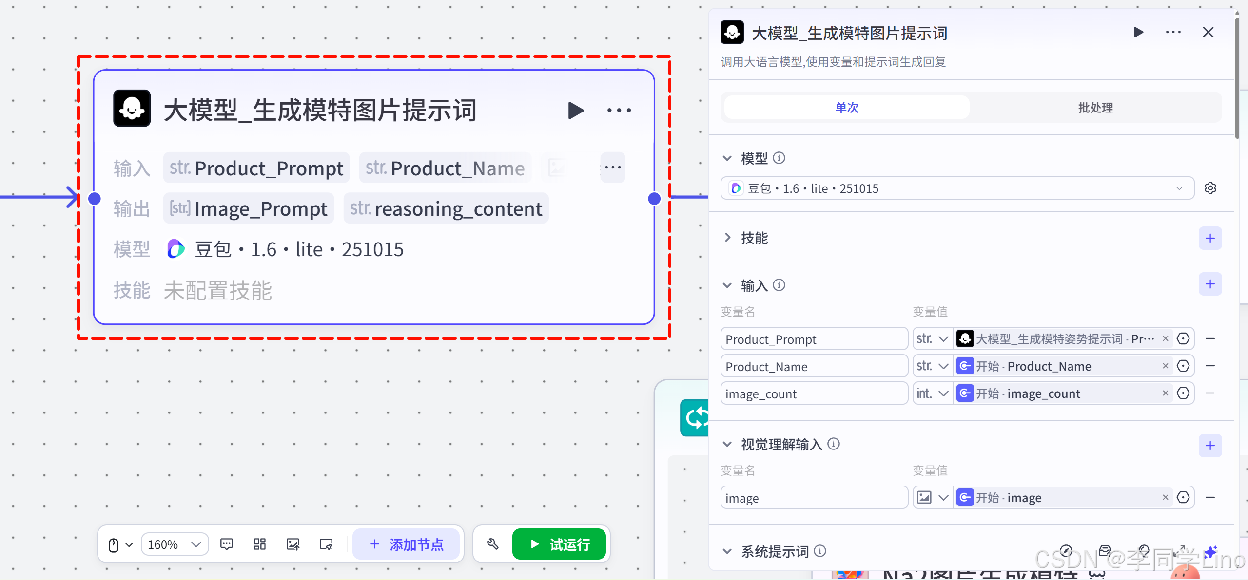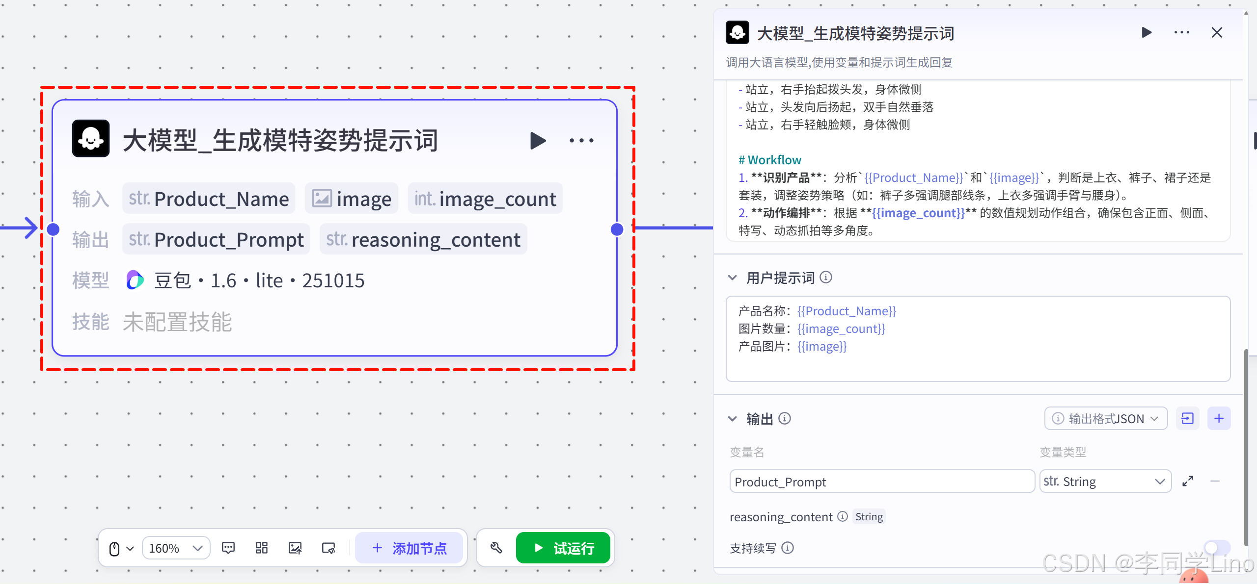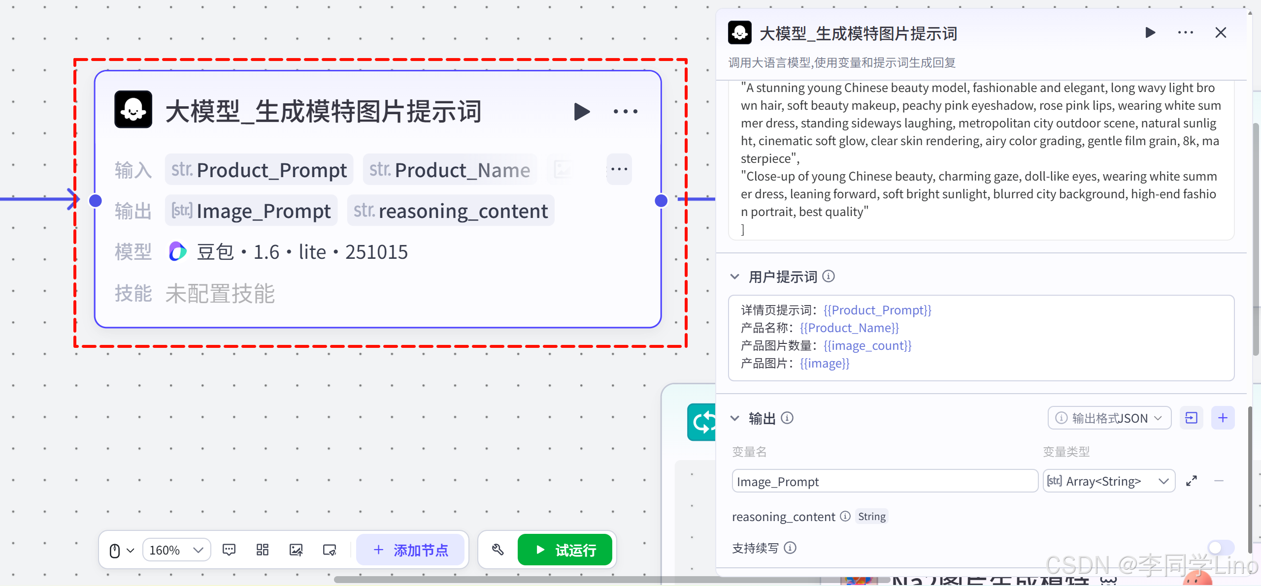 为此,我配置了第二个大模型节点:大模型_生成模特图片提示词。