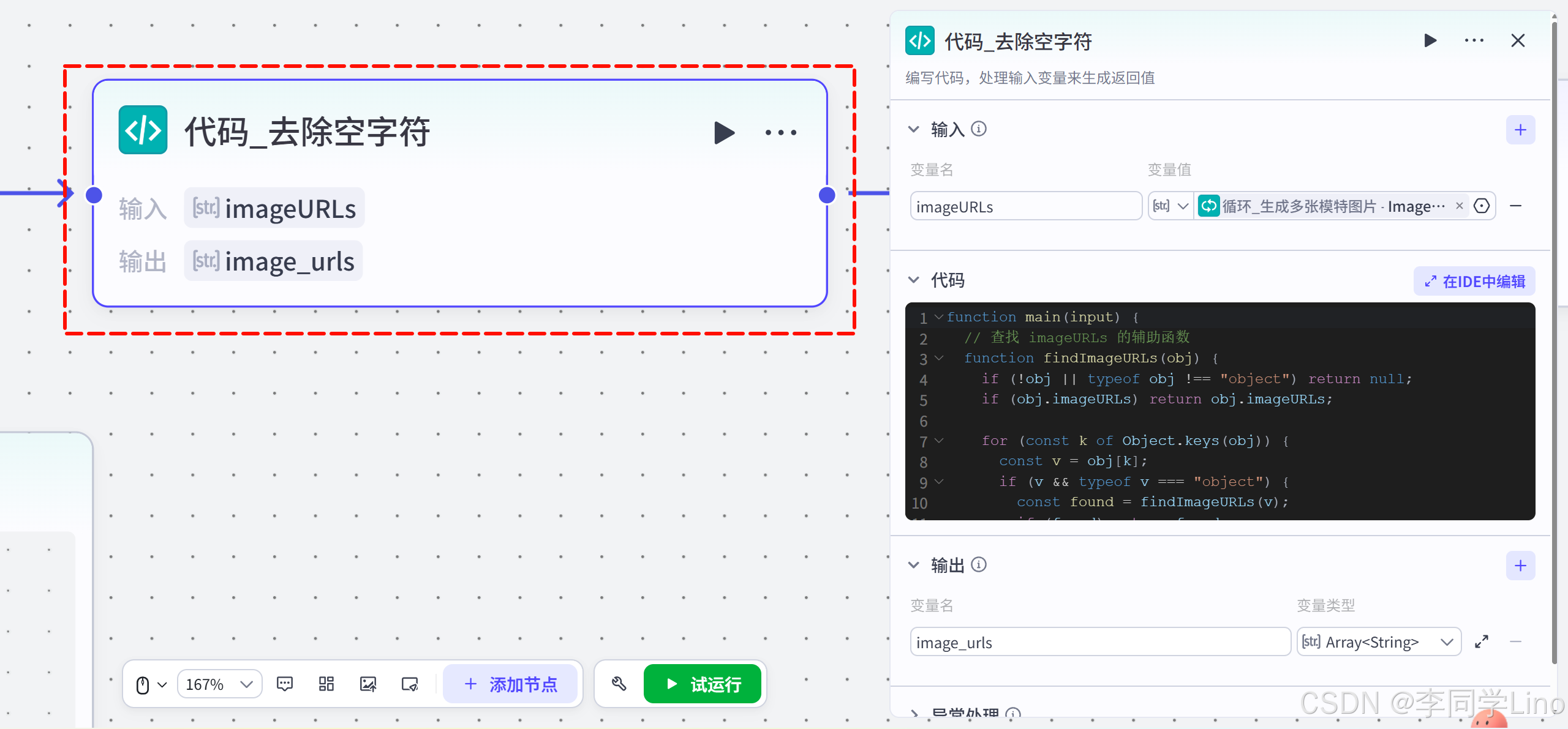 经过循环节点,我们手里已经有了一把图片链接。但为了防止 AI 偶尔“抽风”生成失败(导致链接为空),或者为了格式更整洁,建议加一个简单的代码节点兜底,这也是一个成熟工作流的标志。