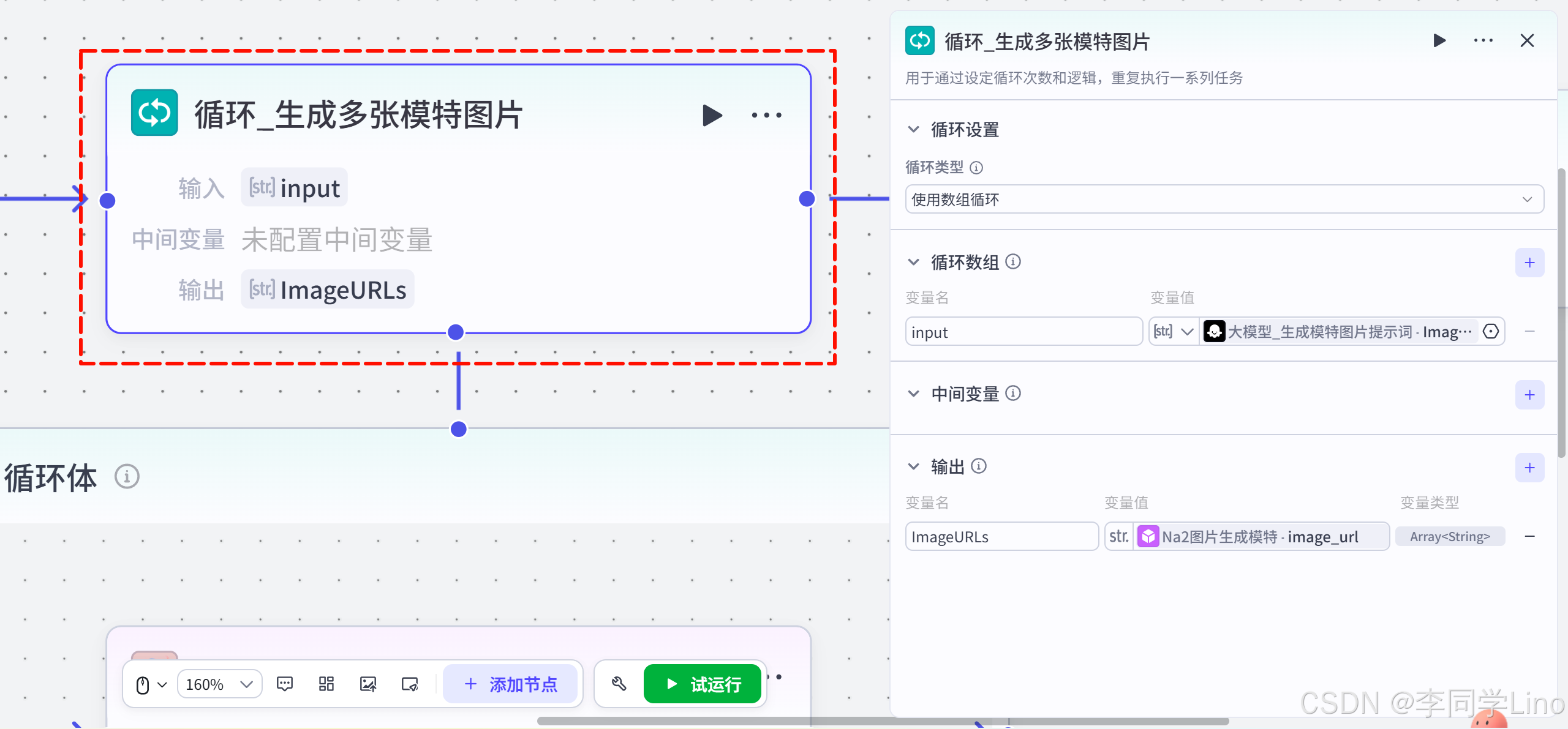 等循环体内的插件配置好之后,我们回到 Loop 节点外部的设置面板。此时,神奇的事情发生了: