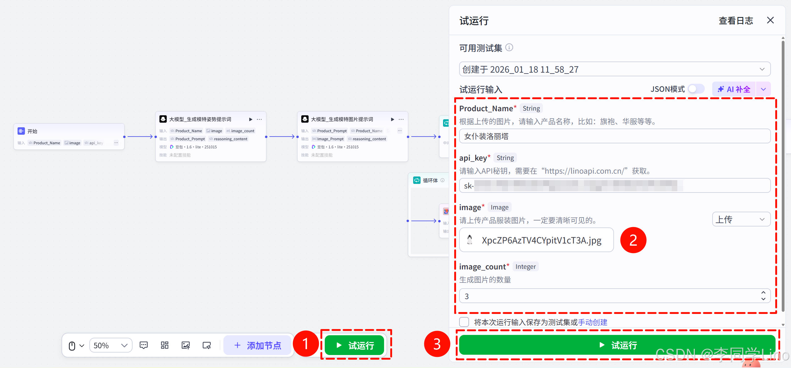 一切配置就绪,现在到了最激动的检验成果环节。点击画布右上角(或底部)的 “试运行” 按钮,系统会弹出一个侧边栏让我们输入测试数据。