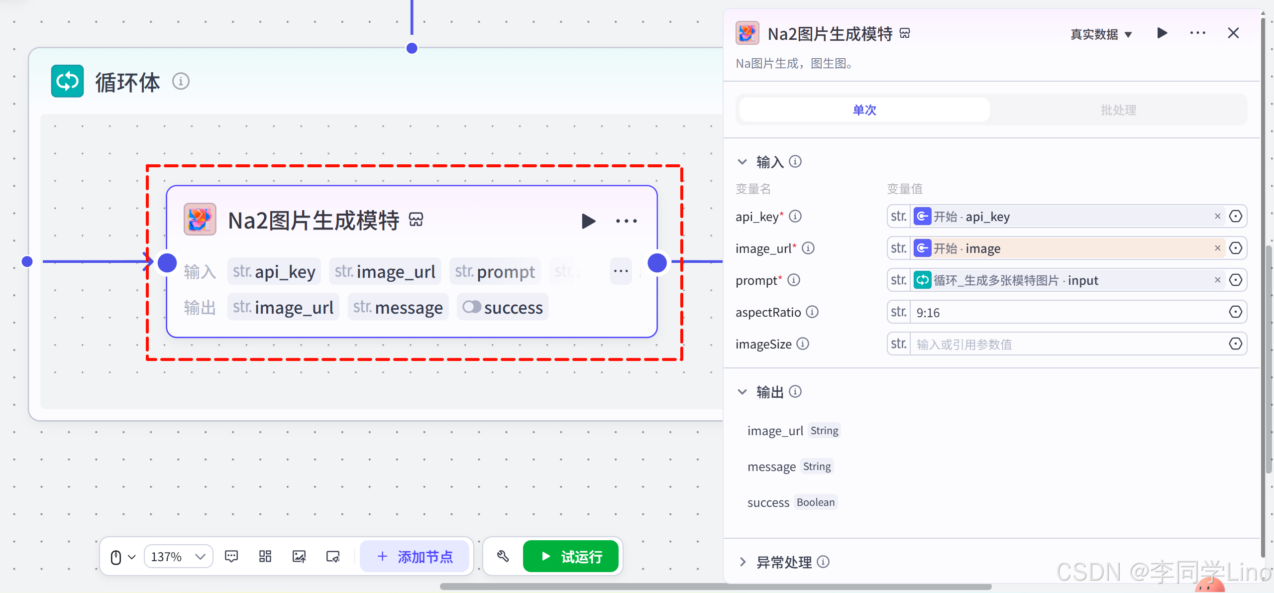 请注意: 很多同学配置完上面就急着去设置循环节点的“输出变量”,结果发现下拉菜单里空空如也。正确的逻辑是:你必须先在“循环体”内部把插件跑通,外部才能抓取到结果。