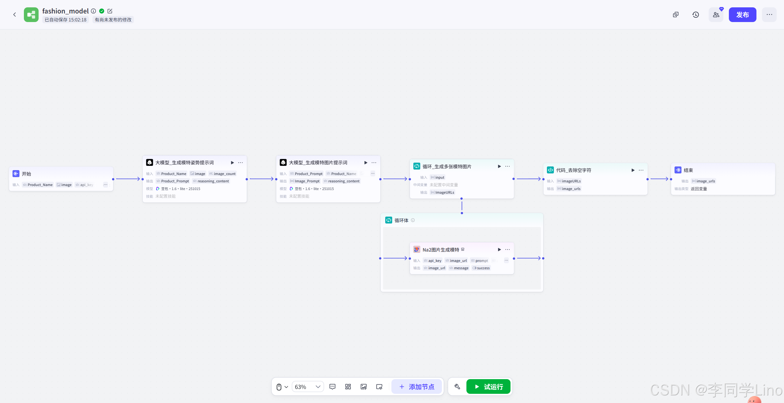 在开始节点之后,我没有直接调用绘图插件,而是接入了一个大模型节点:大模型_生成模特姿势提示词。这是整个工作流的“大脑”,它决定了生成的模特图是否专业、姿势是否丰富。