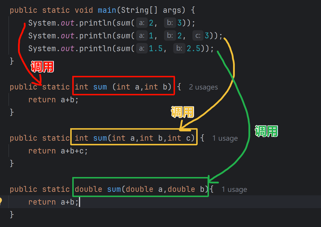 add(1, 2); // 调⽤add(int, int)