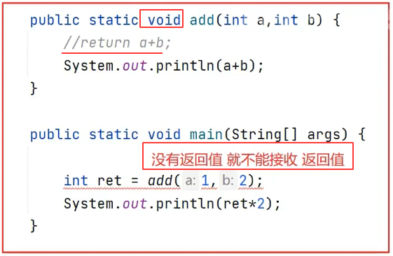 2.没有返回值的情况下,方法的返回值类型为void