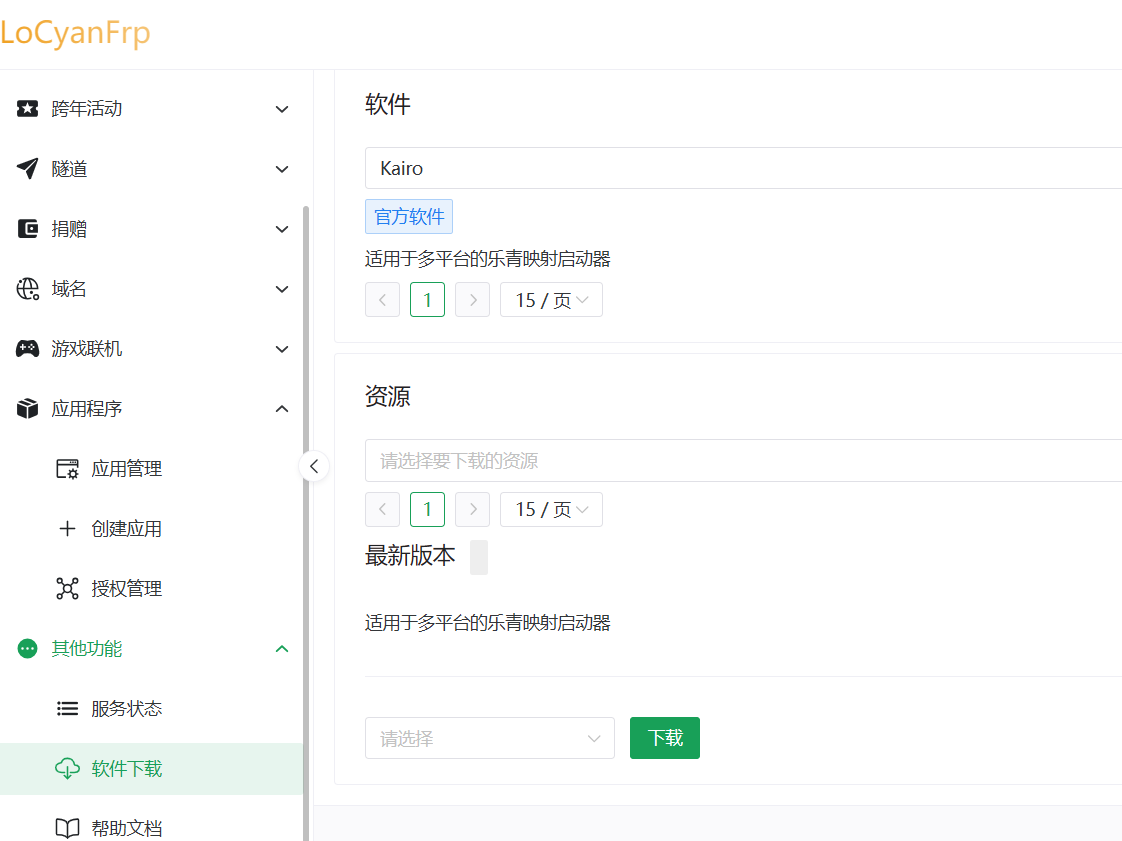 其次需要您打开乐青映射https://www.locyanfrp.cn/的官网下载他的启动器kairo,或者您可以选择下载他的纯净版客户端Frpc,都是可以的