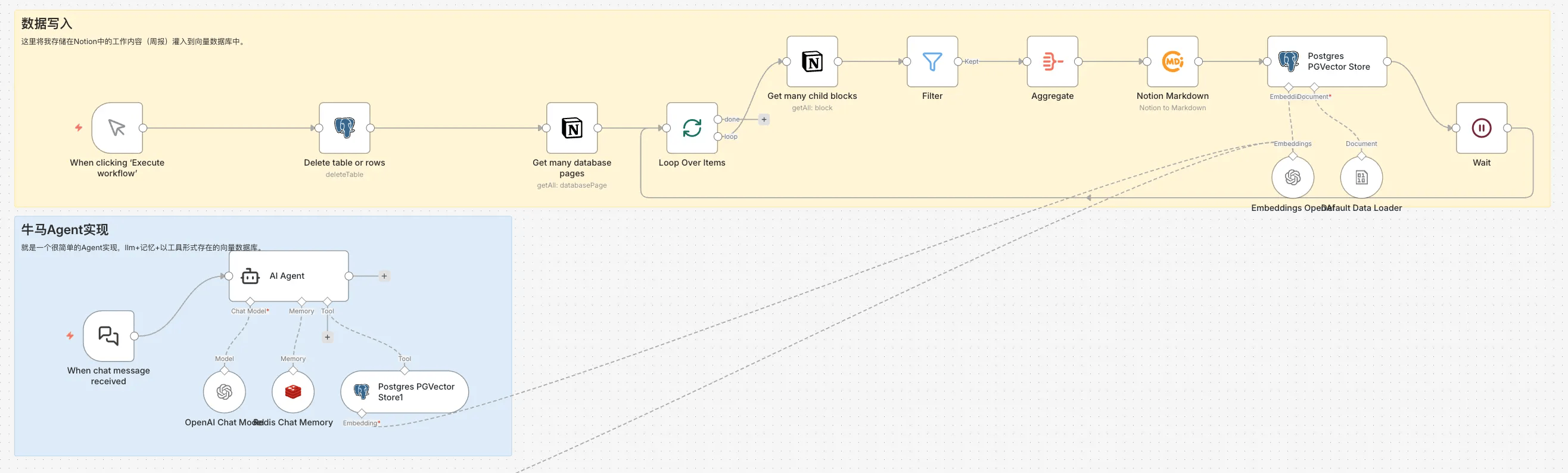 - 数据写入:数据初始化流程,手动触发将 Notion 中记录的工作内容召回并导入向量数据库。这里使用基于 PostgreSQL 实现的 PGVector,n8n 中有对应节点可直接使用。