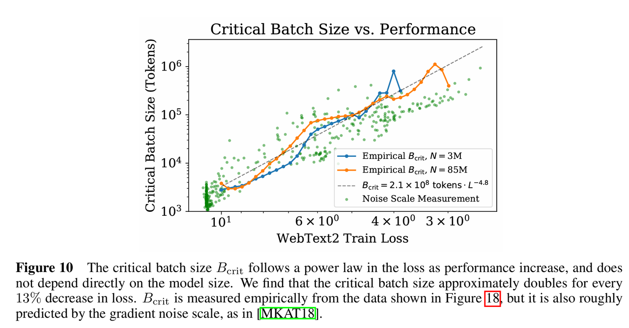 不直接取决于模型大小,而是取决于当前的损失值,随着模型性能提升(损失降低),临界批量大小会变大。