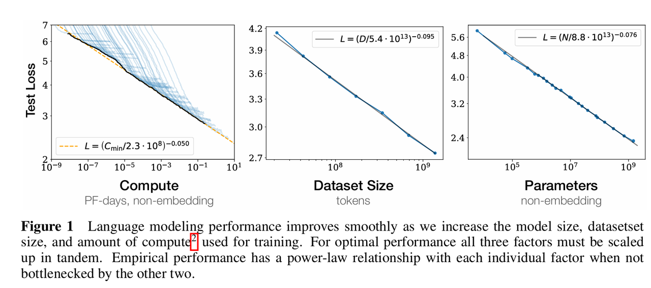 文章首先确立了研究对象为Transformer架构的语言模型,并定义了影响性能(以交叉熵损失衡量)的三个主要尺度因子:模型规模 (N):非嵌入参数的数量;数据集大小 (D):训练用的Token数量 ;计算量 (C):训练所消耗的浮点运算次数。