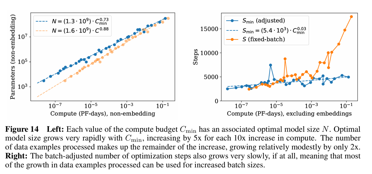 ,这意味着每当计算预算增加 10 倍,模型参数量应该增加 5 倍以上);最优批量大小适度增长(24%);最优训练步数增长极慢,几乎不变(3%)。意味着无论你有多少算力,最优的训练迭代次数(串行步数)几乎不需要增加,算力的增加主要通过并行处理更大的 Batch 和更大的模型来消耗。