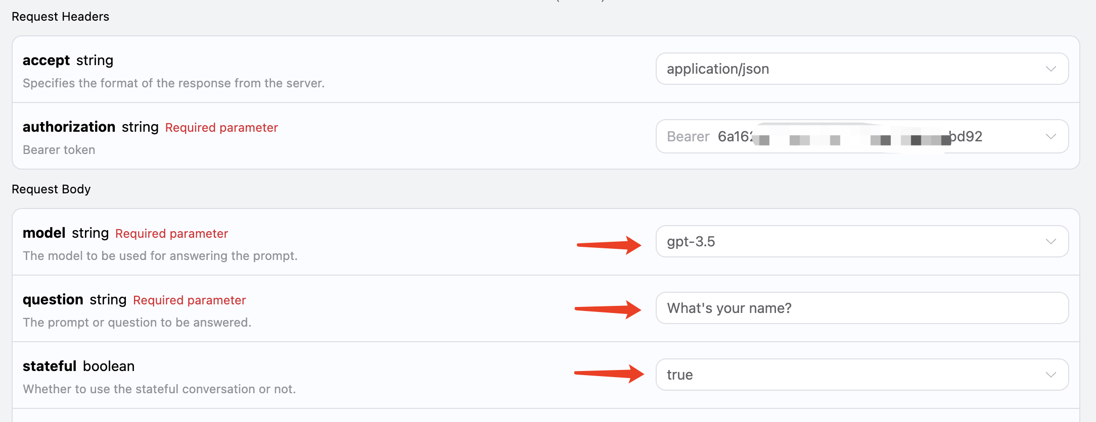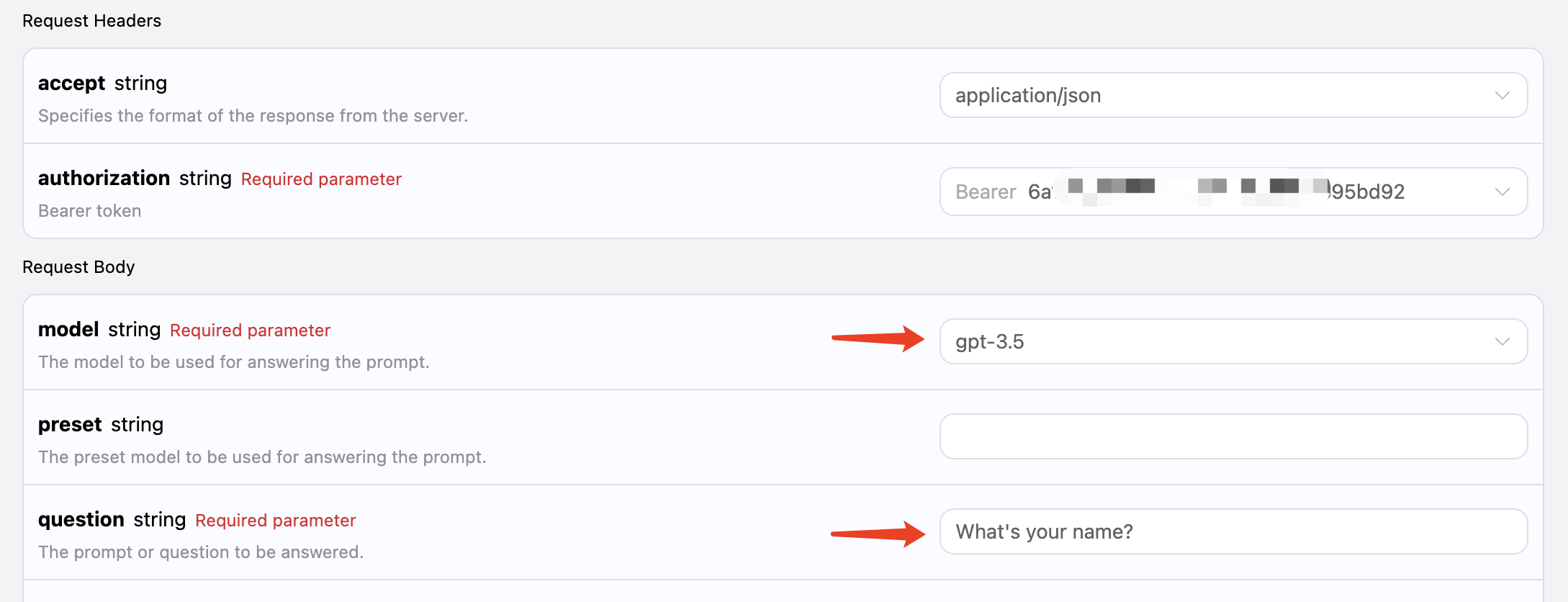 payload = { "model": "gpt-3.5", "question": "What's your name?" }